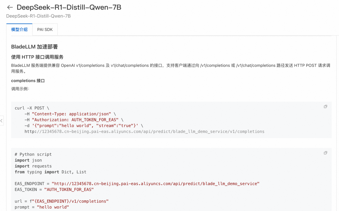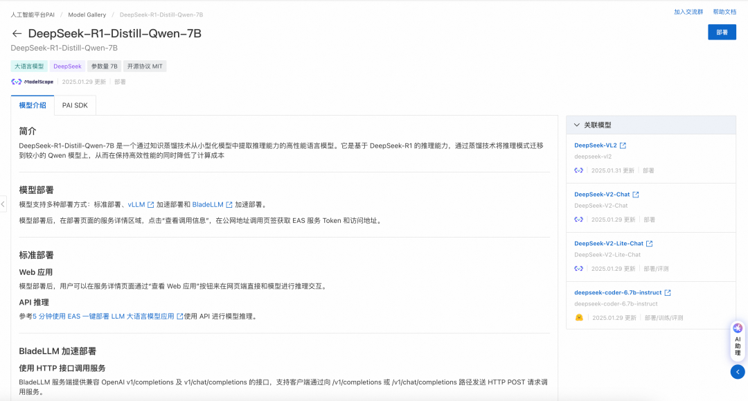 需要注意的是,阿里云官方教程部署的模型为蒸馏过后的 DeepSeek-R1-Distill-Qwen-7B。基于 DeepSeek-R1 的推理能力,通过蒸馏技术将推理模式迁移到了较小的 Qwen 模型上。同时,阿里云 PAI Model Gallery 也提供 DeepSeek-R1、DeepSeek-V3 原始模型的一键部署。