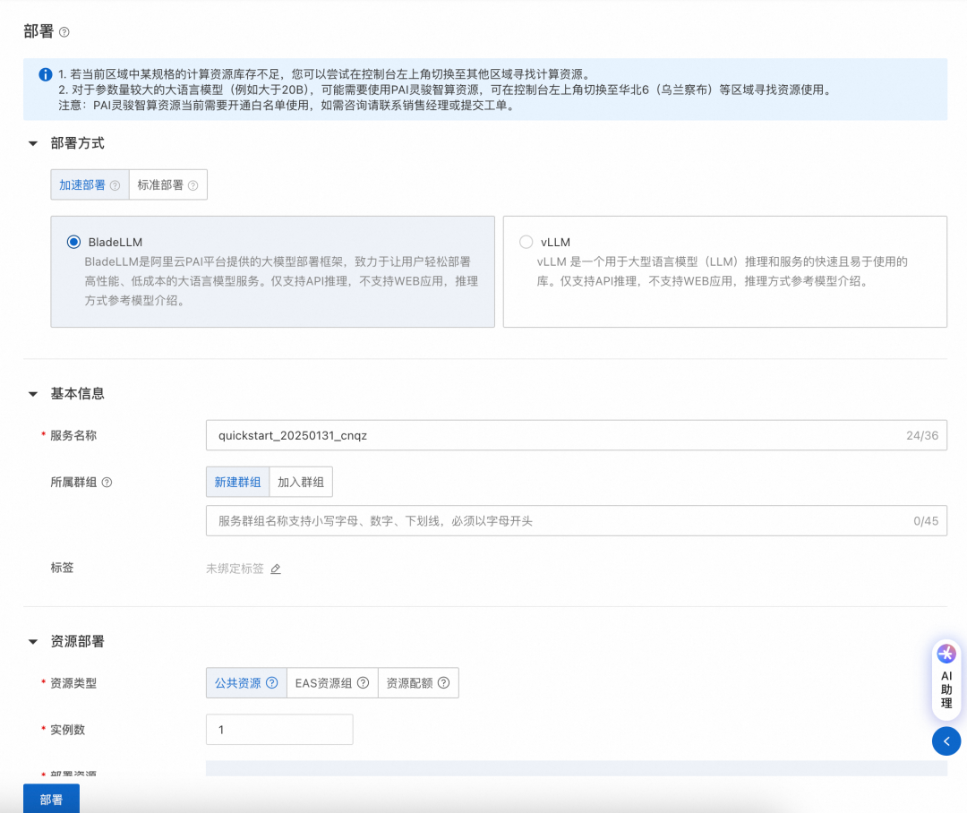 单击右上角部署:目前 DeepSeek-R1 支持采用 vLLM 加速部署;DeepSeek-V3 支持 vLLM 加速部署以及 Web 应用部署;DeepSeek-R1 蒸馏小模型支持采用 BladeLLM(阿里云 PAI 自研高性能推理框架)和 vLLM 加速部署。选择部署方式和部署资源后,即可一键部署服务,生成一个 PAI-EAS 服务。