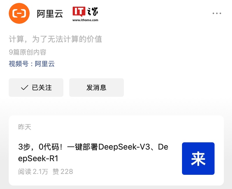 IT之家 2 月 4 日消息,阿里云计算有限公司昨日发文官宣,阿里云 PAI Model Gallery 支持云上一键部署 DeepSeek-V3、DeepSeek-R1。