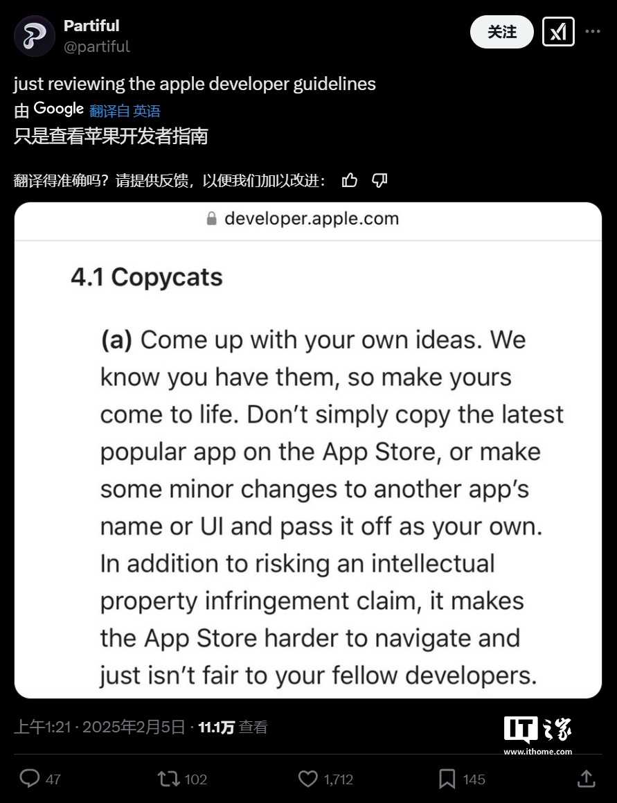 IT之家 2 月 5 日消息,知名活动应用及网站 Partiful 的开发者表示,苹果公司新发布的 Invites 应用可能违反了苹果自家的 App Store 指南。Partiful 在其社交媒体账号上分享了一张截图,内容为 App Store 规则 4.1,该规则明确禁止抄袭应用。