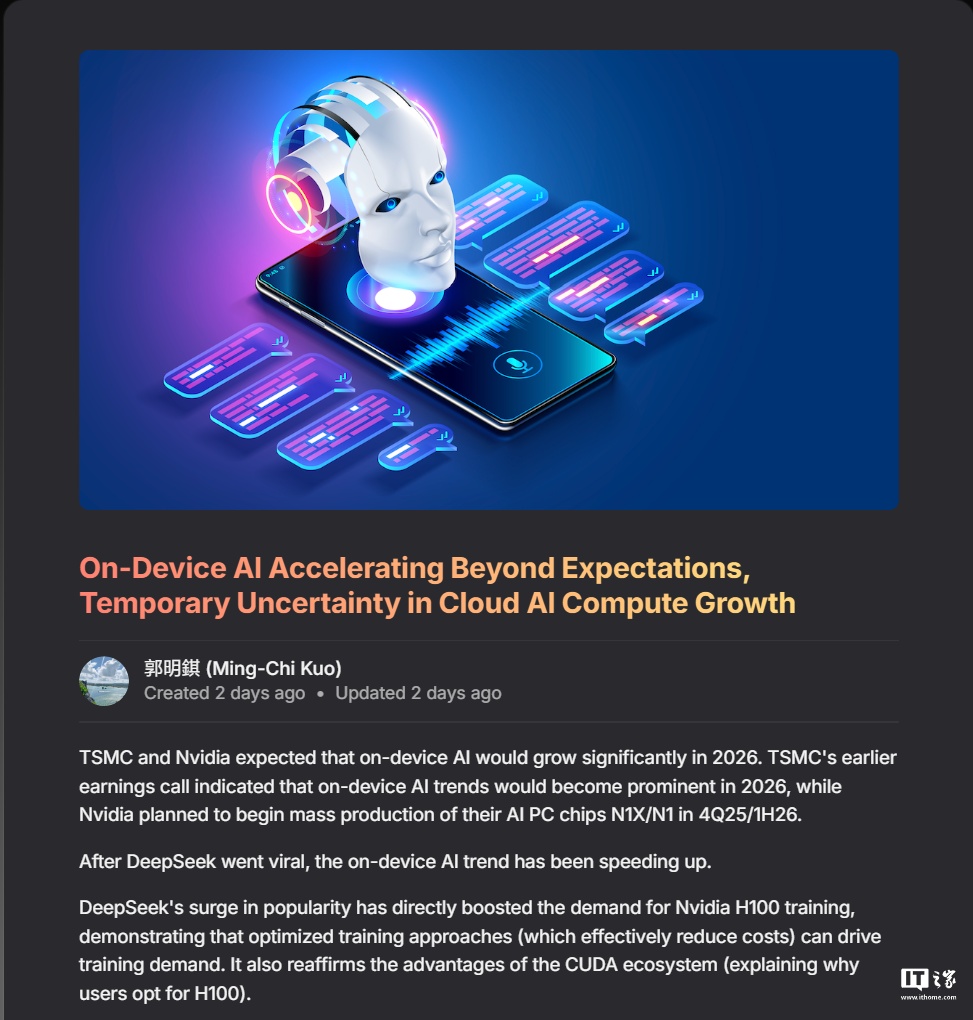 IT之家 2 月 5 日消息,天风国际分析师郭明錤于 5 日发文称,DeepSeek 爆红后,端侧 AI 的发展速度加快。DeepSeek 的流行直接推动了英伟达 H100 训练需求的增长,表明优化的训练方法(可有效降低成本)能够刺激市场,同时也再次证明了 CUDA 生态的竞争力(用户为何选择 H100)。