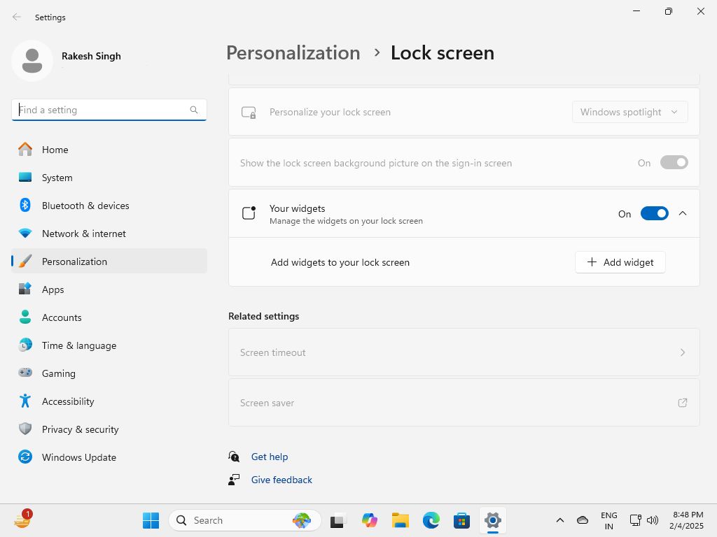 在“锁屏”页面,用户可以在“你的小组件”部分管理小组件,包括天气、股票、体育、交通等。这些小组件与任务栏上的 MSN 信息流中的小组件相同。