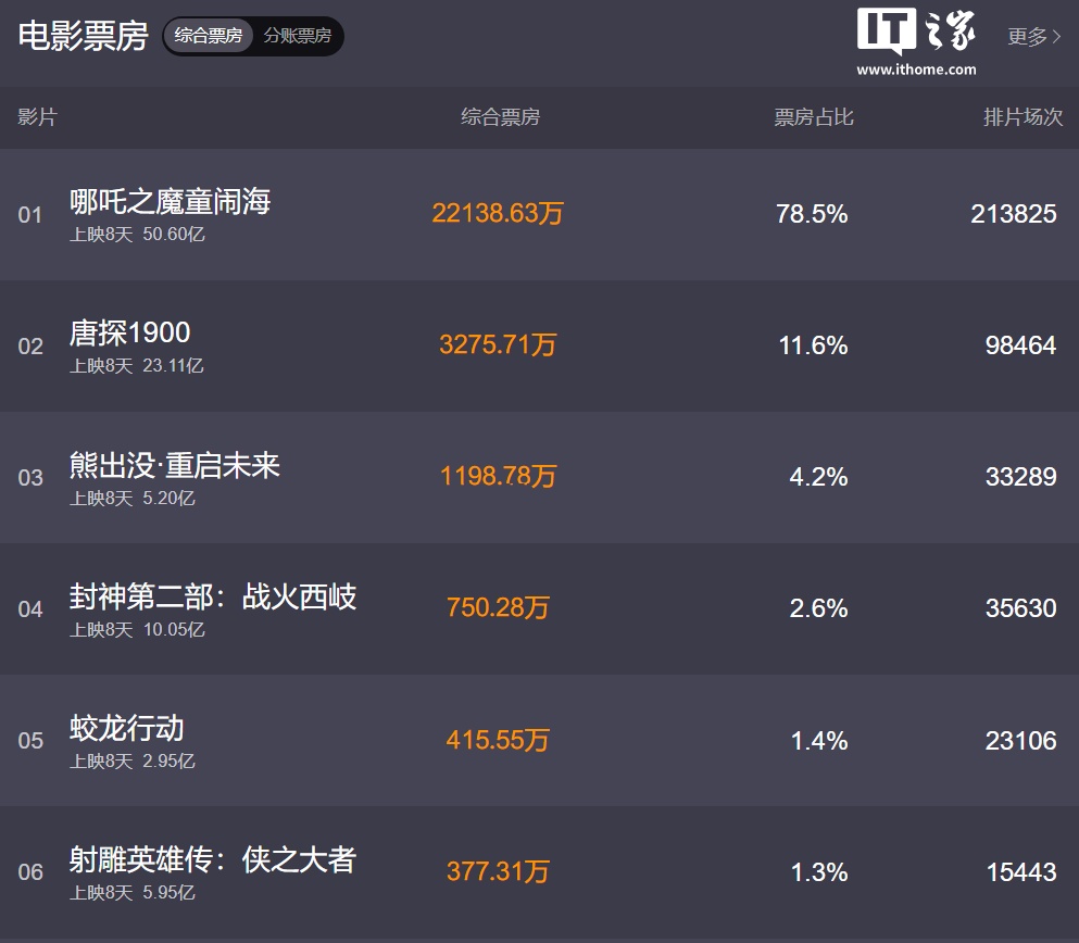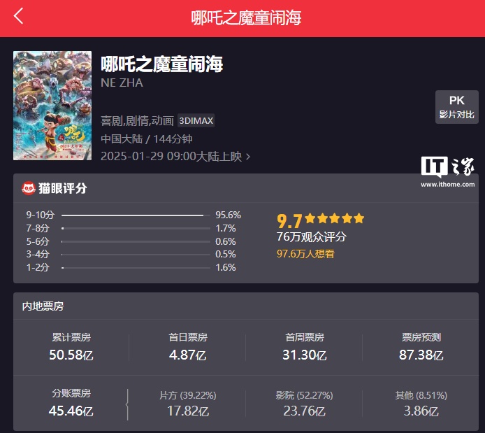 截至IT之家发文,猫眼专业版对《哪吒之魔童闹海》的预测票房已经达到了 87.38 亿,拿下中国影史票房第一基本板上钉钉了。