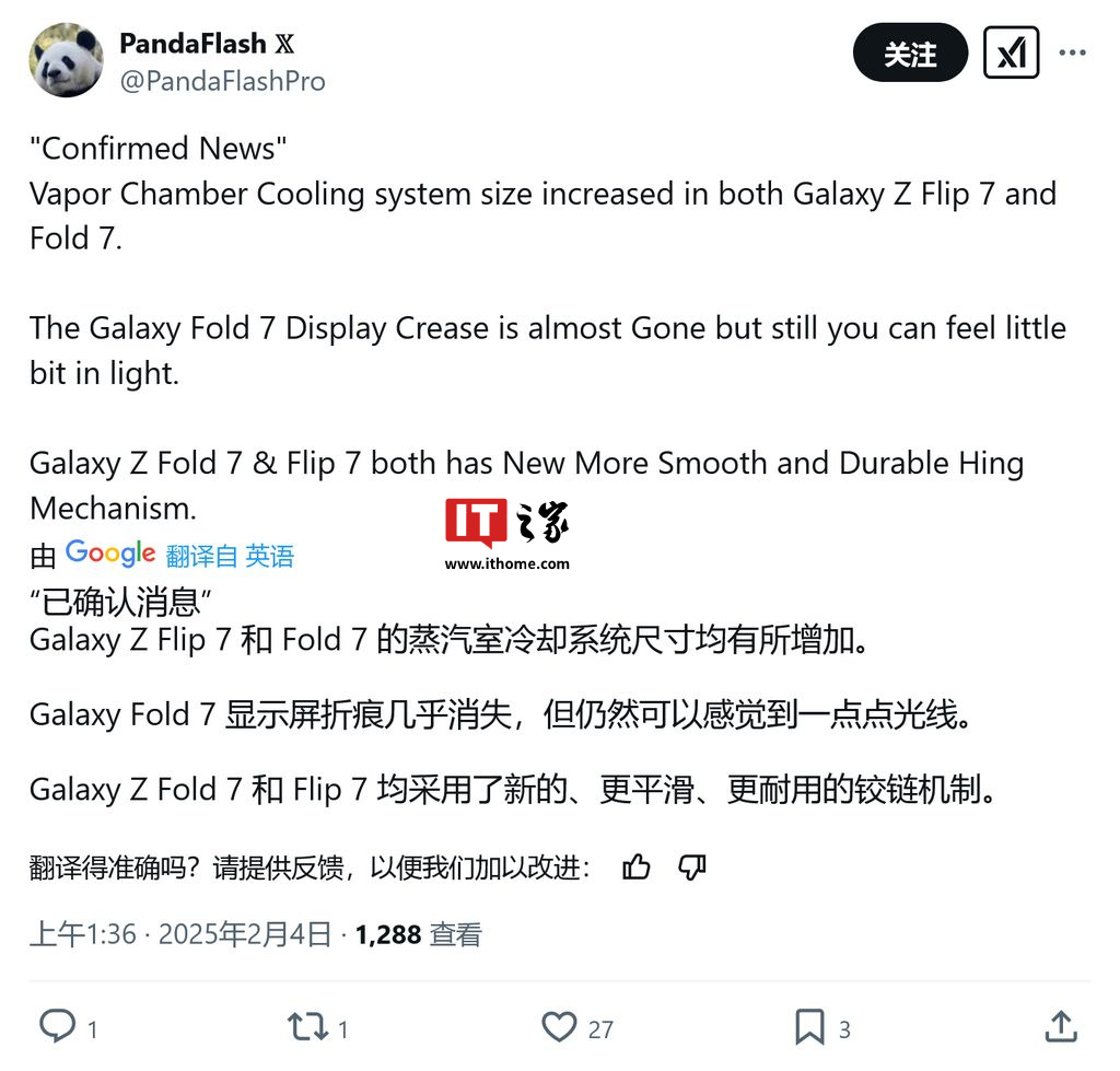 IT之家 2 月 5 日消息,消息源 @PandaFlashPro 昨日(2 月 4 日)在 X 平台发布推文,曝料称三星大幅优化 Galaxy Z Fold7 折叠手机的屏幕折痕,几乎不可见,只有在调整光线角度的时候,才有看到轻微的折痕。