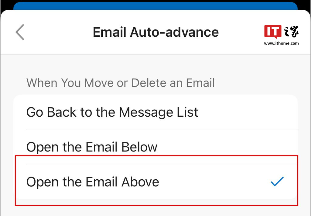 IT之家查询博文介绍,微软还计划本月更新 iOS 版 Outlook 应用,新增“打开上一封邮件”设置。用户在处理完当前邮件(例如移动或删除)后,系统将自动打开列表中的上一封邮件。