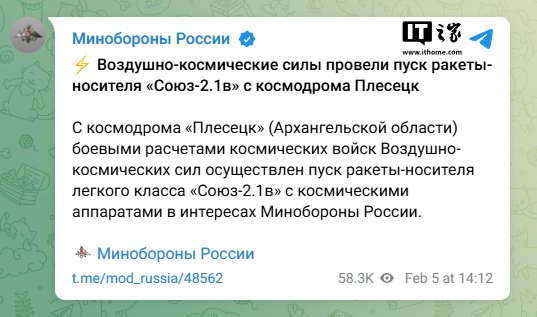 IT之家 2 月 5 日消息,俄罗斯国防部今日通报称,俄空天部队在阿尔汉格尔斯克州普列谢茨克航天发射场成功发射了一枚“联盟-2.1v”(Союз 2.1в) 轻型运载火箭,搭载了供俄国防部使用的秘密航天器。