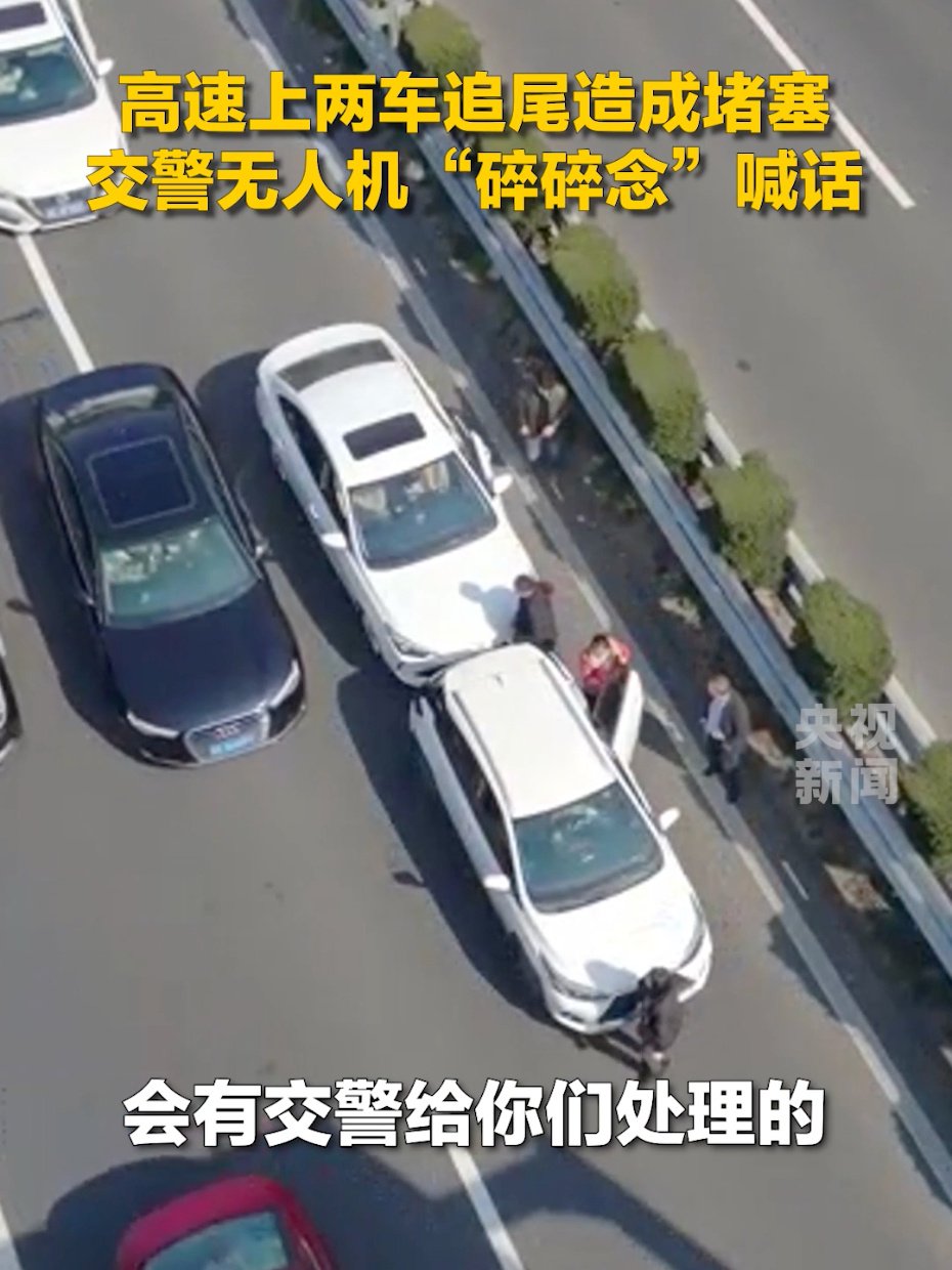 央视新闻 1 月 20 日报道,浙江丽水,高速上两车追尾造成拥堵,追尾的两车在商议处理的时候,执勤的“空中交警”利用警用无人机向高速上发生事故的车辆乘客喊话,高效处理了事故。