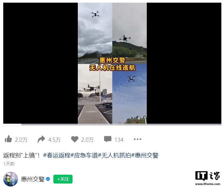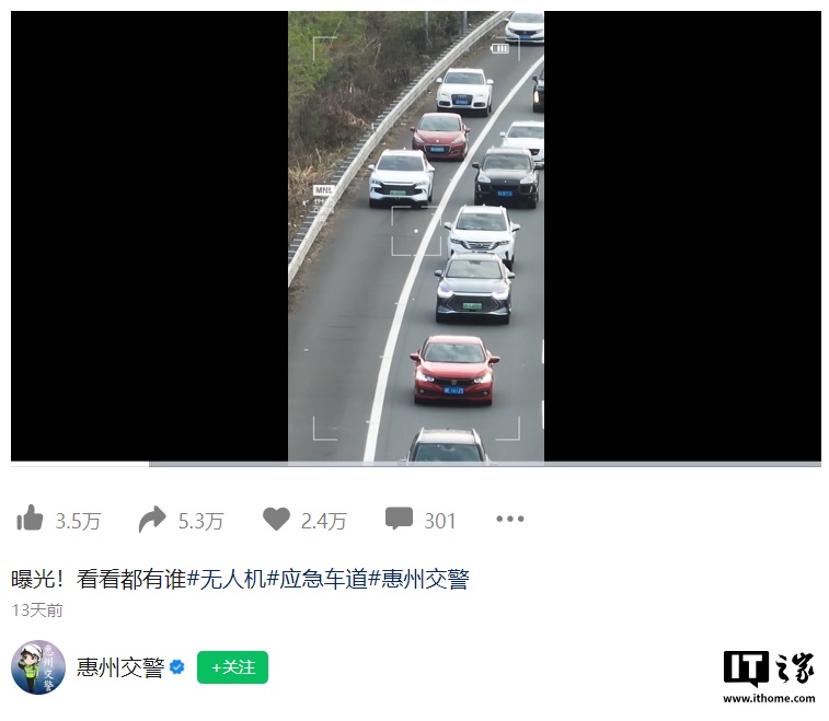 惠州交警昨日晒出视频,通过无人机巡查来抓拍占用高速应急车道的行为。视频中,多辆汽车被清晰拍到车牌号。由于无人机拥有较好的机动性,能够随时随地抓拍违法行为。