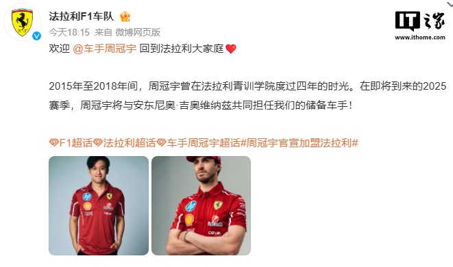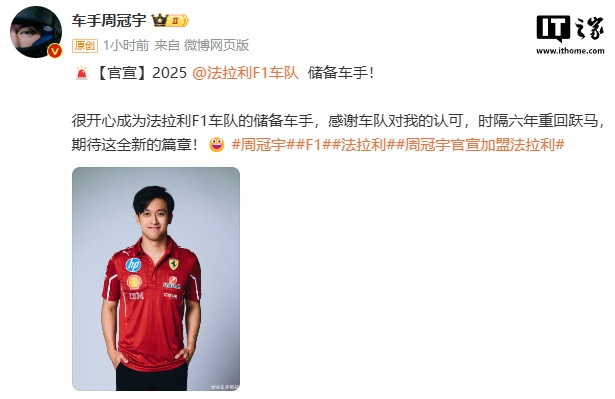 IT之家 2 月 5 日消息,中国首位 F1 车手周冠宇今日官宣成为 2025 法拉利 F1 车队储备车手:“很开心成为法拉利 F1 车队的储备车手,感谢车队对我的认可,时隔六年重回跃马,期待这全新的篇章!”