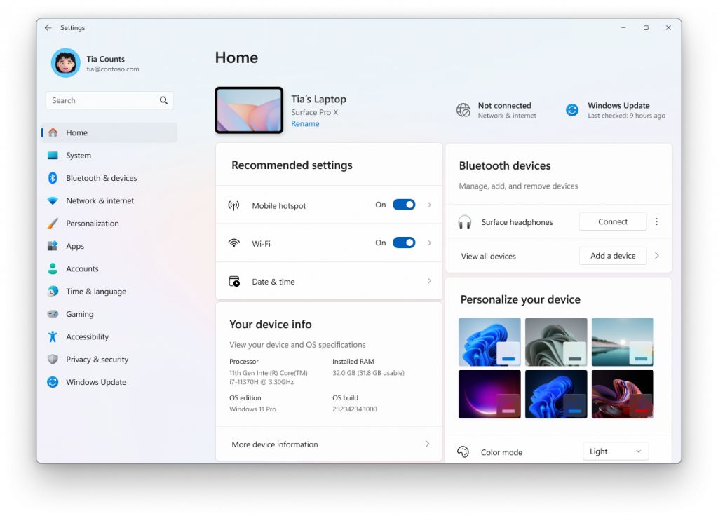 微软开始为 IT 管理员管理的 PC 上的商业客户推出设置主页。该功能将显示一些与企业管理 PC 相关的现有卡片,如 "推荐设置" 和 "蓝牙设备",以及两张新的企业特定设备信息和辅助功能偏好卡片。