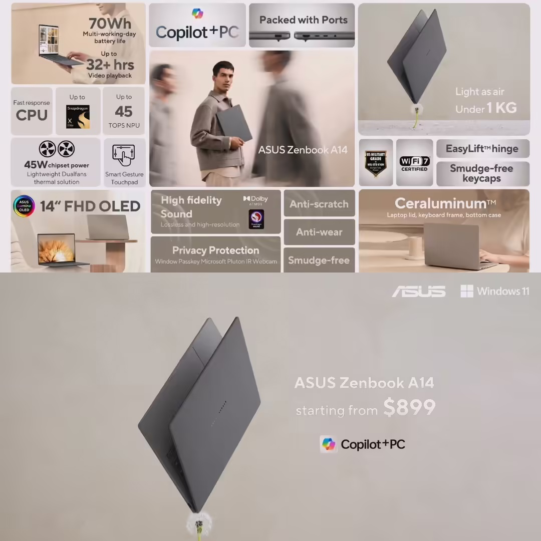 而在本月初,华硕在海外发布了新一代 Zenbook A14 骁龙版,其在国内正好对应灵耀 14(骁龙版),且为首款全陶瓷铝材质的华硕笔记本电脑,899 美元(当前约 6544 元人民币)起。