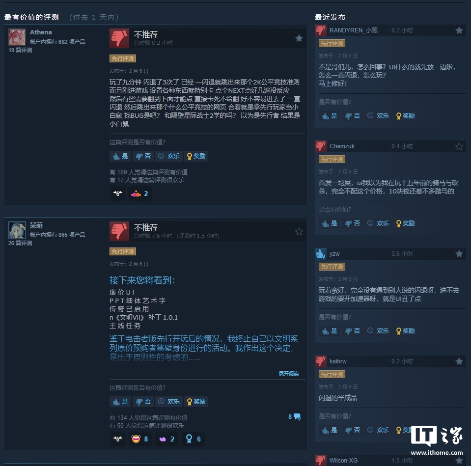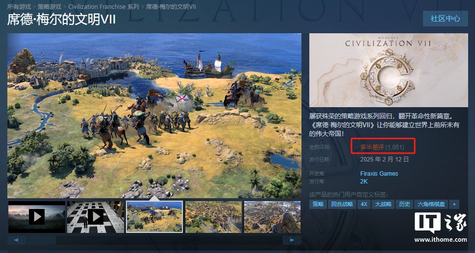 IT之家 2 月 6 日消息,《文明 7》游戏将于 2 月 12 日正式发售,在此之前已经有豪华版玩家解锁了这款游戏,Steam 平台显示为“多半差评”,有部分玩家反馈出现“闪退”等问题。