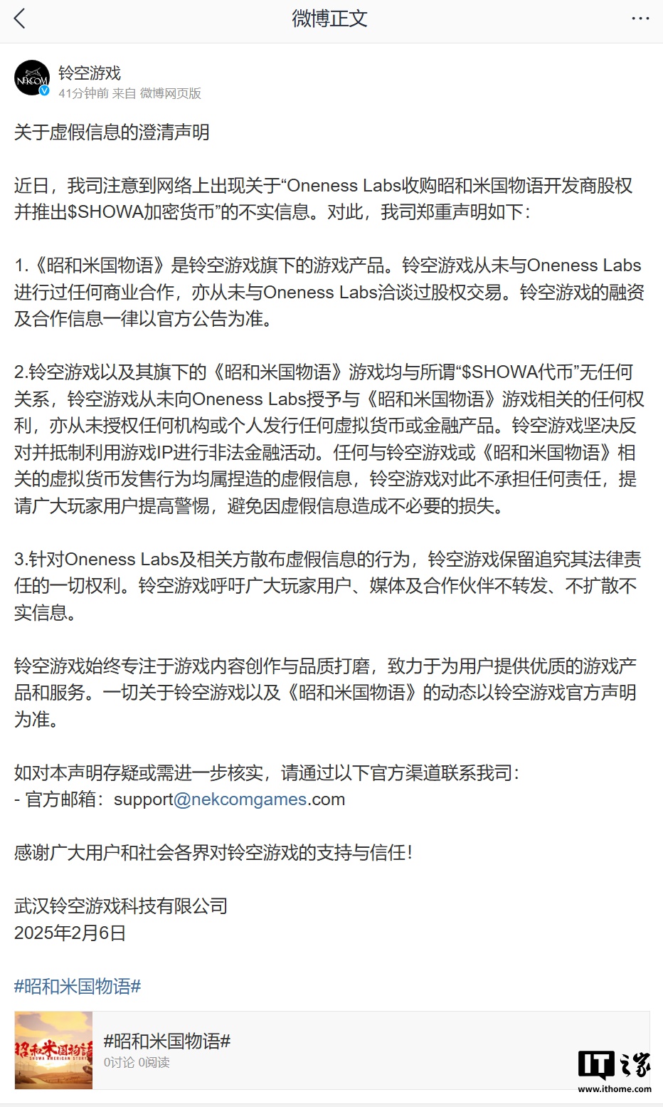 2.铃空游戏以及其旗下的《昭和米国物语》游戏均与所谓“$SHOWA 代币”无任何关系,铃空游戏从未向 Oneness Labs 授予与《昭和米国物语》游戏相关的任何权利,亦从未授权任何机构或个人发行任何虚拟货币或金融产品。铃空游戏坚决反对并抵制利用游戏 IP 进行非法金融活动。任何与铃空游戏或《昭和米国物语》相关的虚拟货币发售行为均属捏造的虚假信息,铃空游戏对此不承担任何责任,提请广大玩家用户提高警惕,避免因虚假信息造成不必要的损失。