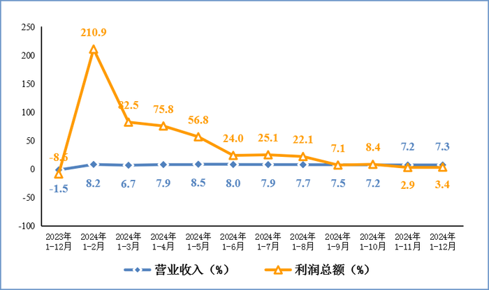 2024 年,规模以上电子信息制造业实现营业收入 16.19 万亿元,同比增长 7.3%;营业成本 14.11 万亿元,同比增长 7.5%;实现利润总额 6408 亿元,同比增长 3.4%;营业收入利润率为 4.0%,较 1-11 月提高 0.04 个百分点。12 月份,规模以上电子信息制造业营业收入 1.74 万亿元,同比增长 8.4%。