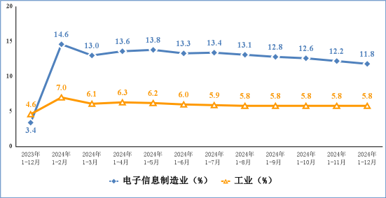 2024 年,电子信息制造业固定资产投资同比增长 12%,较 1-11 月回落 0.6 个百分点,比同期工业投资增速低 0.1 个百分点,比同期高技术制造业投资增速高 5 个百分点。
