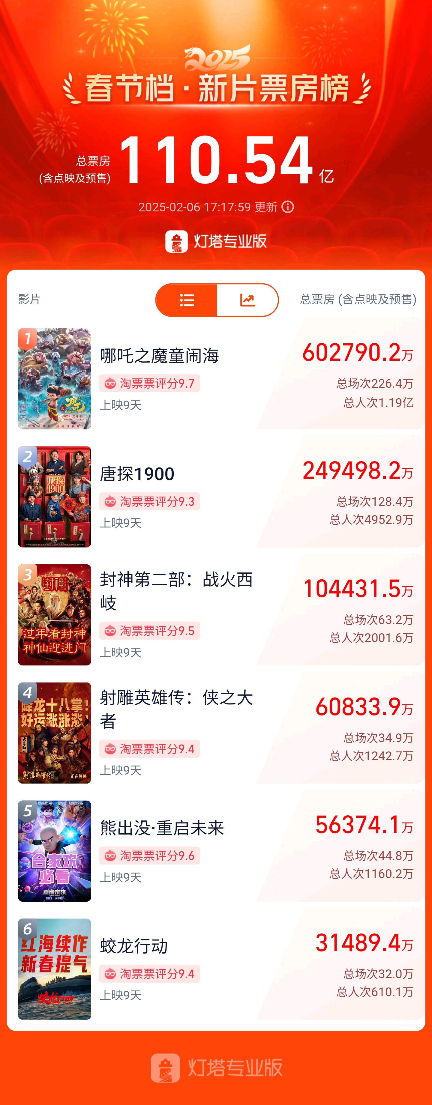 IT之家 2 月 6 日消息,今日早些时候,动画电影《哪吒之魔童闹海》刷新中国影史票房纪录,超越《长津湖》(57.75 亿)成为中国影史票房冠军。然而这部“现象级”影片还在上映当中,纪录也在不断刷新。