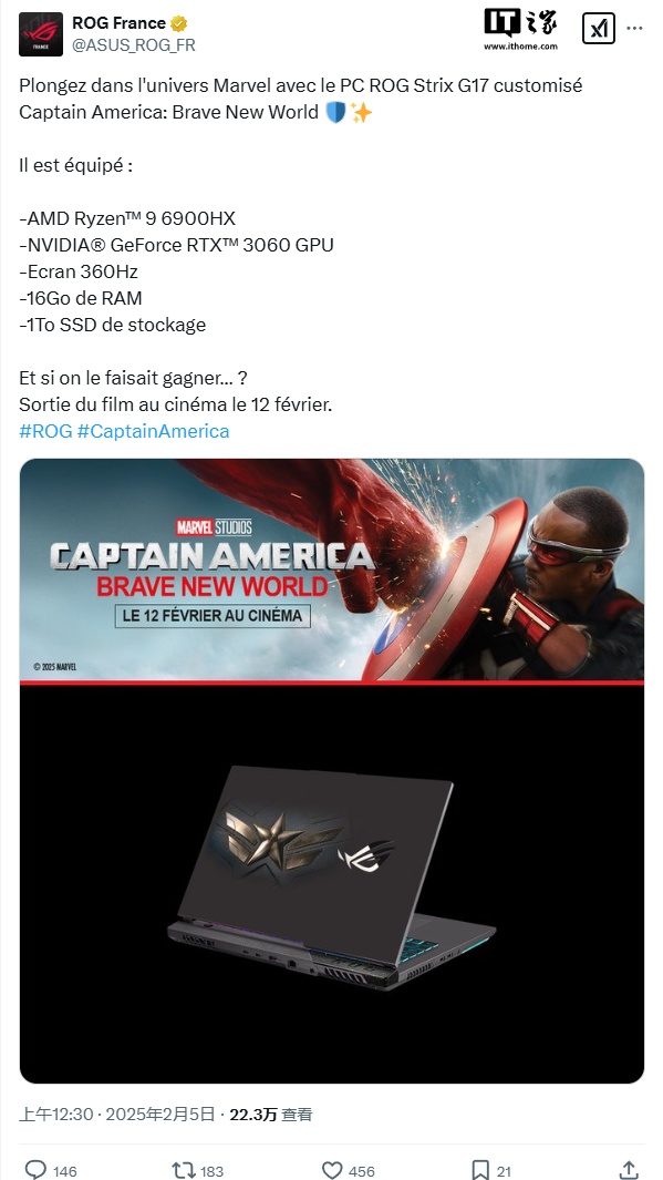 IT之家 2 月 6 日消息,华硕昨日公布了一款《美国队长 4》定制款 ROG Strix G17 游戏笔记本电脑,但引起网友热议的关键点在于其复古配置。