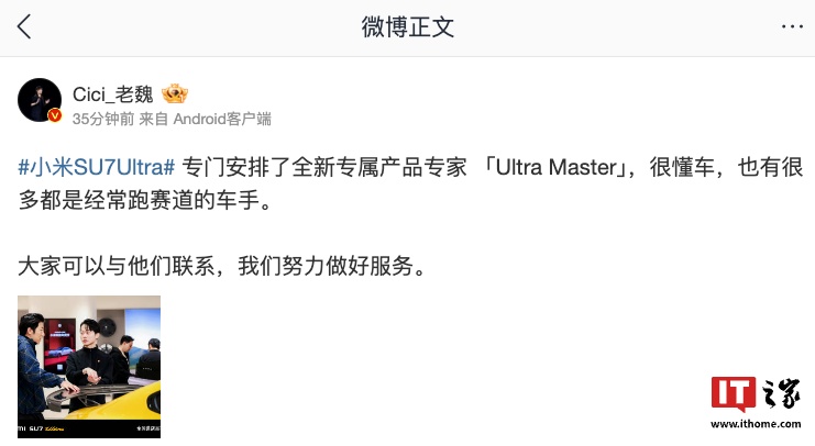小米手机市场部总经理,小米汽车市场部副总经理魏思琪今日发文透露,小米汽车为 SU7 Ultra 车型安排了全新专属产品专家「Ultra Master」。她称专家很懂车,也有很多都是经常跑赛道的车手。
