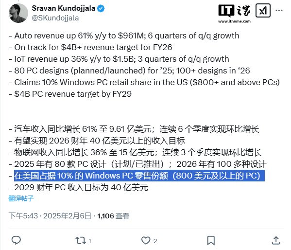 IT之家 2 月 6 日消息,尽管高通计划在未来五年内拿下超过 50% 的 Windows 市场份额,但最新数据显示,其首代骁龙 X 系列芯片未能获得消费者的广泛认可。