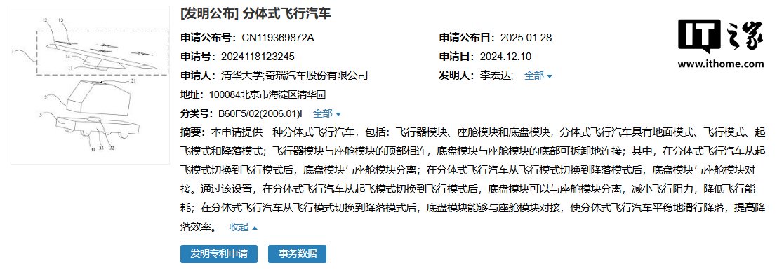 IT之家 2 月 7 日消息,清华大学、奇瑞汽车股份有限公司申请的“分体式飞行汽车”专利于 1 月 28 日公布。