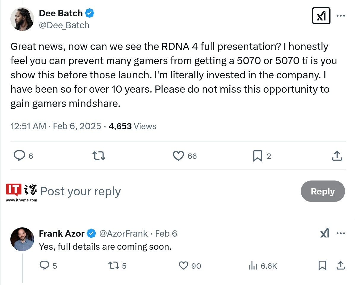 IT之家 2 月 7 日消息,AMD 游戏解决方案和游戏营销首席架构师 Frank Azor 昨日在 X 平台表示,RDNA 4 显卡架构的完整细节即将公布。