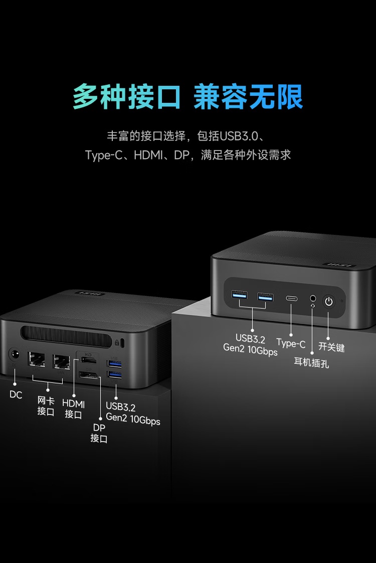 这款小主机支持 DDR4 双通道内存,并提供了两个 M.2 插槽,支持 WiFi 6 网络以及蓝牙 5.2,还提供双千兆网口、四个 USB 3.2 Gen2、Type-C、HDMI、DP、3.5mm 音频接口。其他方面,其尺寸为 138.5*126*50mm,体积约 0.8L,采用涡轮增压散热系统。