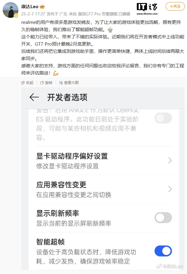 IT之家 2 月 7 日消息,realme UI 产品经理 @康达Leo 今日透露:“realme 的用户有很多是游戏发烧友,为了让大家的游戏体验更加流畅,拥有更持久的稳帧体验,我们推出了智能超帧功能。”