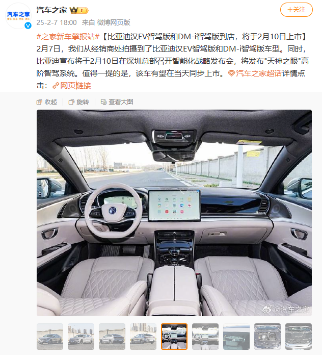 IT之家 2 月 7 日消息,汽车之家发现比亚迪汉 EV 智驾版和 DM-i 智驾版车型已经抵达经销商门店,预计将于 2 月 10 日举行的智能化战略发布会上迎来上市。