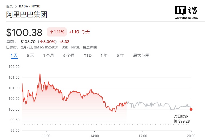 IT之家 2 月 7 日消息,今日晚间,阿里巴巴美股盘前突然拉升,目前已经涨超 6%。