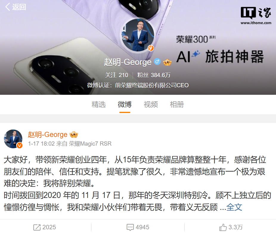 荣耀 CEO 赵明离职成为近期手机行业内的热议话题。据IT之家此前报道,不久前的 1 月 17 日,原荣耀 CEO 赵明在内网、微博各发布一篇长文,确认将离开荣耀,未来规划修整和学习。当日早些时候,荣耀内部官宣赵明因个人原因辞职,李健接任 CEO 一职。