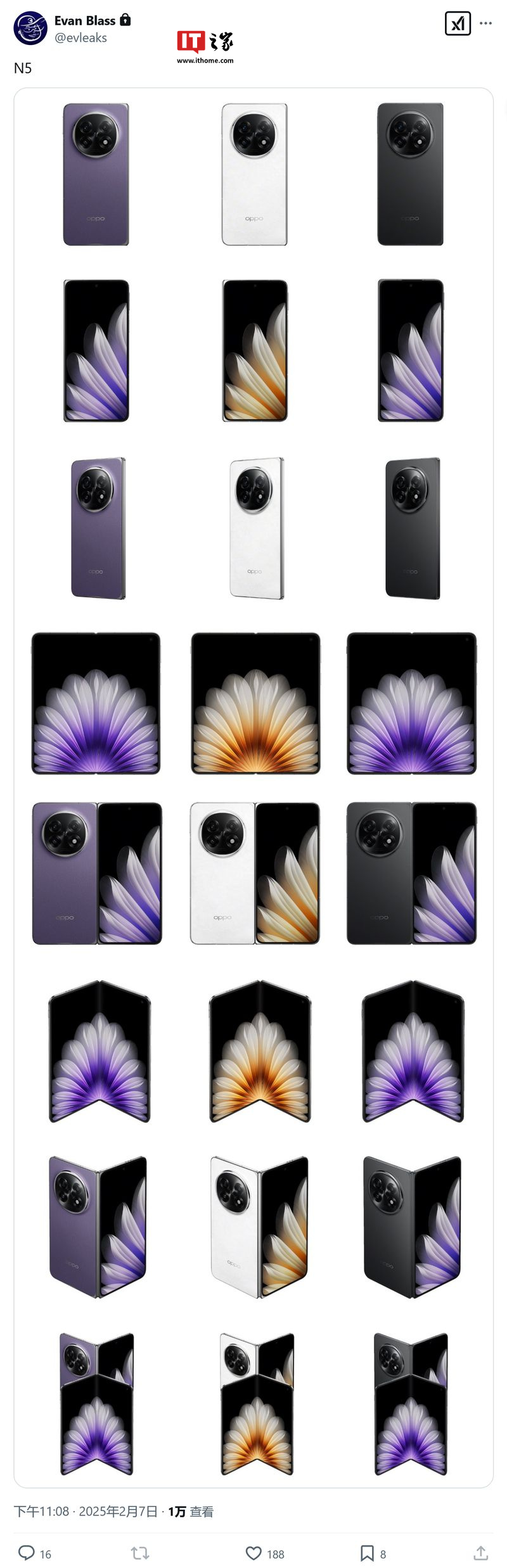 IT之家 2 月 8 日消息,消息源 @Evleaks 昨日(2 月 7 日)在 X 平台发布推文,分享了 OPPO Find N5 折叠手机的高清渲染图,显示了紫色、白色和黑色三种颜色。
