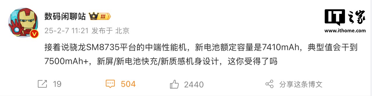 IT之家 2 月 8 日消息,博主 @数码闲聊站 透露了一款骁龙 SM8735 平台的中端神秘新机,该机据称电池额定容量为 7410mAh,典型值为 7500mAh+,该机采用新屏幕面板,拥有质感机身设计,参考评论区,这款手机有望为小米 REDMI Turbo 4 Pro 手机。