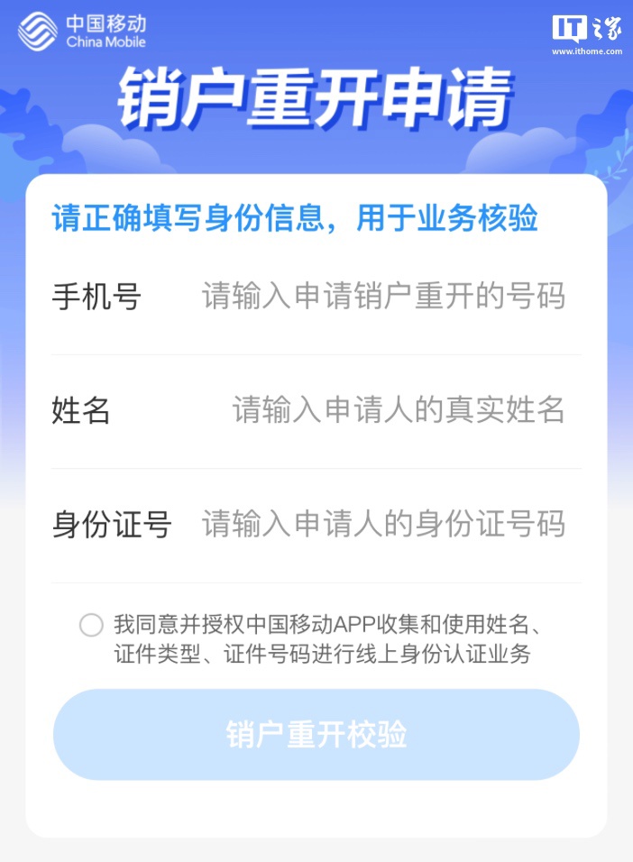 IT之家获悉,线上销户仅支持身份证入网用户,每月 1-6 号及最后一天不可办理线上销户业务,线上销户仅支持余额转移,余额转移号码需要与销户号码为同身移动号码,如果用户未填写相应号码,则代表放弃余额转移,正式销户业务办理结果及余额转移到账时间以短信通知为准。