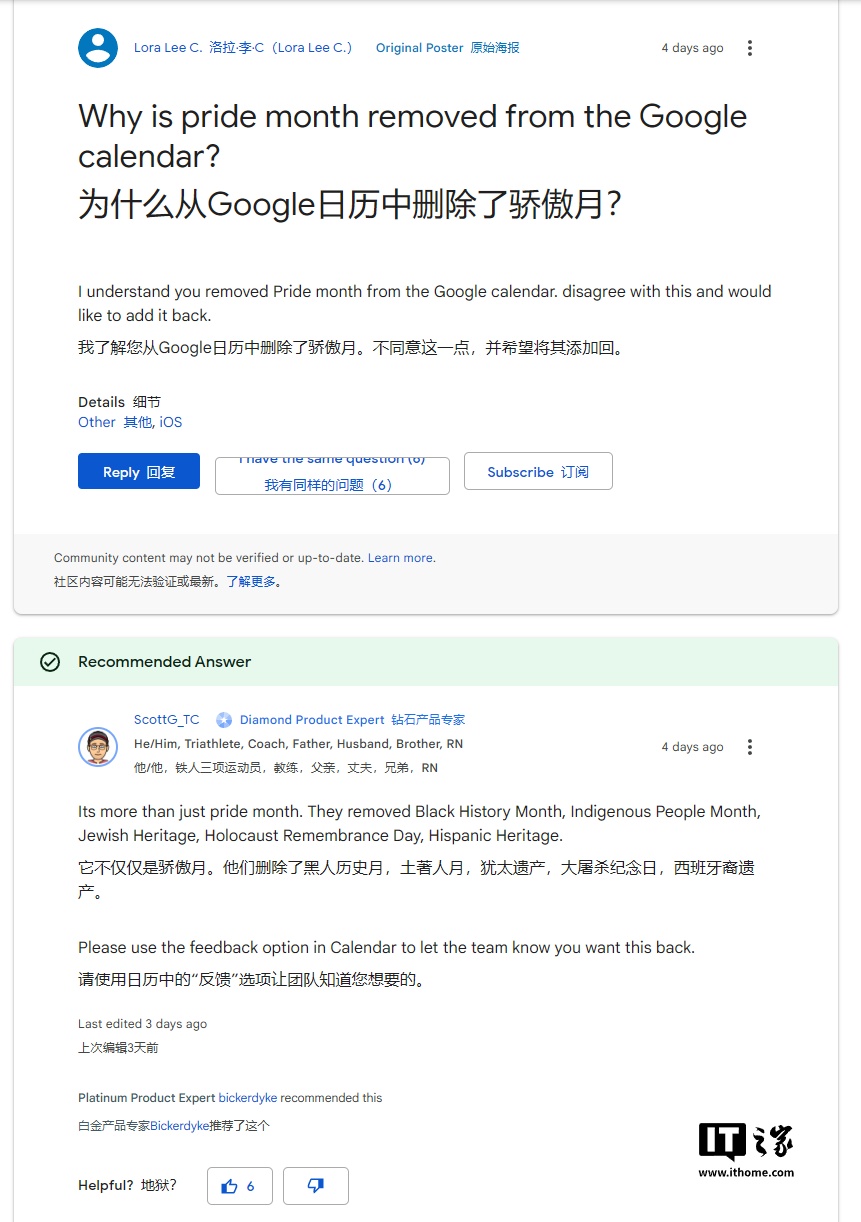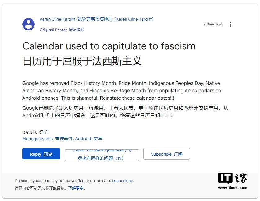 IT之家 2 月 8 日消息,谷歌日历的一项更改引发了部分用户的强烈不满。据一位谷歌产品专家透露,像“骄傲月”(Pride Month)这样的特定活动不再被谷歌日历默认突出显示。此外,包括黑人历史月、原住民月、犹太遗产月、大屠杀纪念日以及拉丁裔遗产月在内的多个重要节日和纪念日也均已被移除。