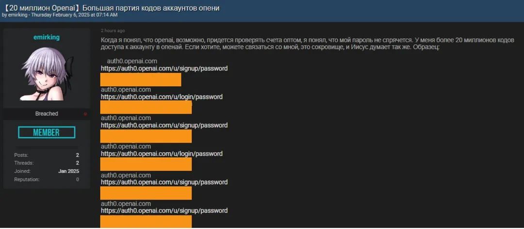 一位匿名黑客在暗网论坛发布俄语信息,声称拥有超过 2000 万个 OpenAI 账户的访问代码,并称之为“金矿”,还提供了包含电子邮件地址和密码的样本数据。IT之家附上图片如下: