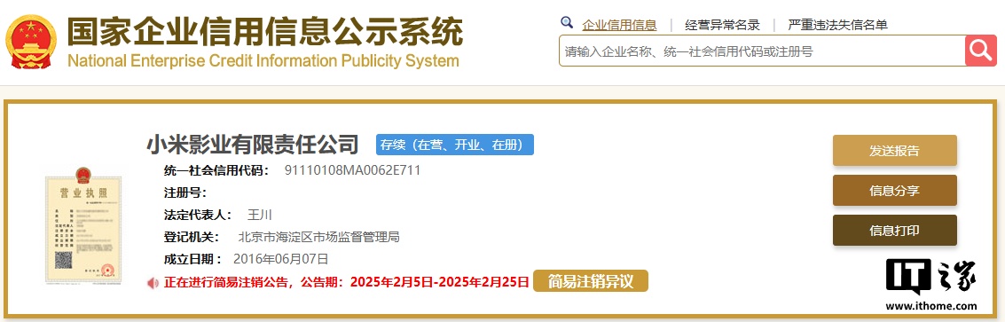 IT之家 2 月 8 日消息,国家企业信用信息公示系统显示,小米影业有限责任公司正在进行简易注销公告,公告期为 2025 年 2 月 5 日-2025 年 2 月 25 日。