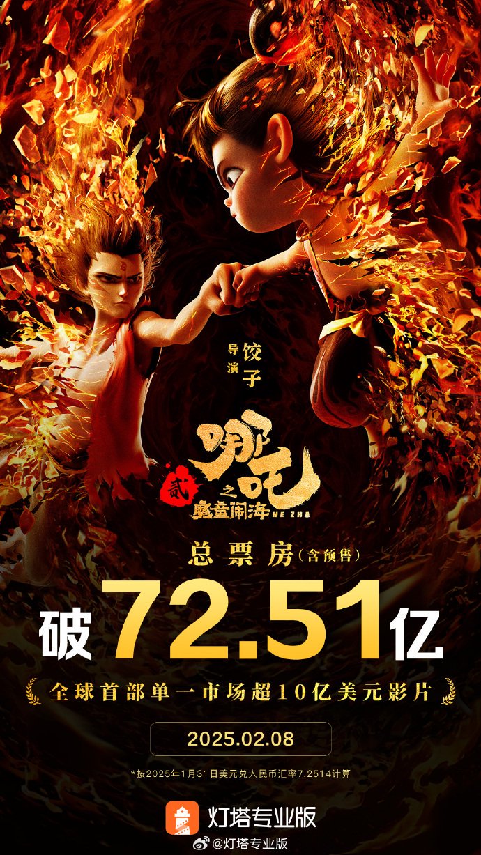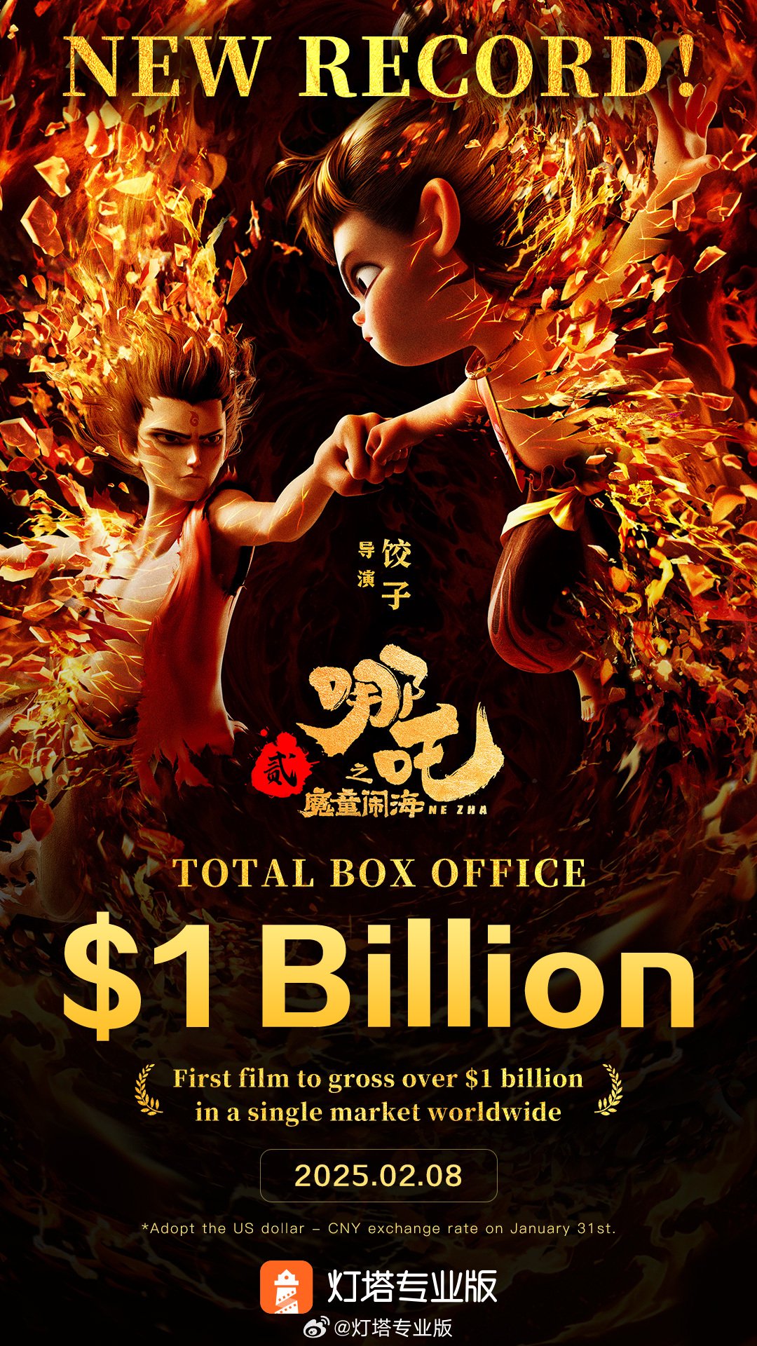 至此,《哪吒之魔童闹海》成为全球单一市场首部破 10 亿美元的影片,也是进入全球十亿美元票房俱乐部首部非好莱坞影片。