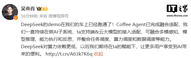 IT之家 2 月 8 日消息,长城汽车 CTO 吴会肖今日宣布,DeepSeek 的 demo 在长城汽车上已经跑通,Coffee Agent 已完成融合适配。