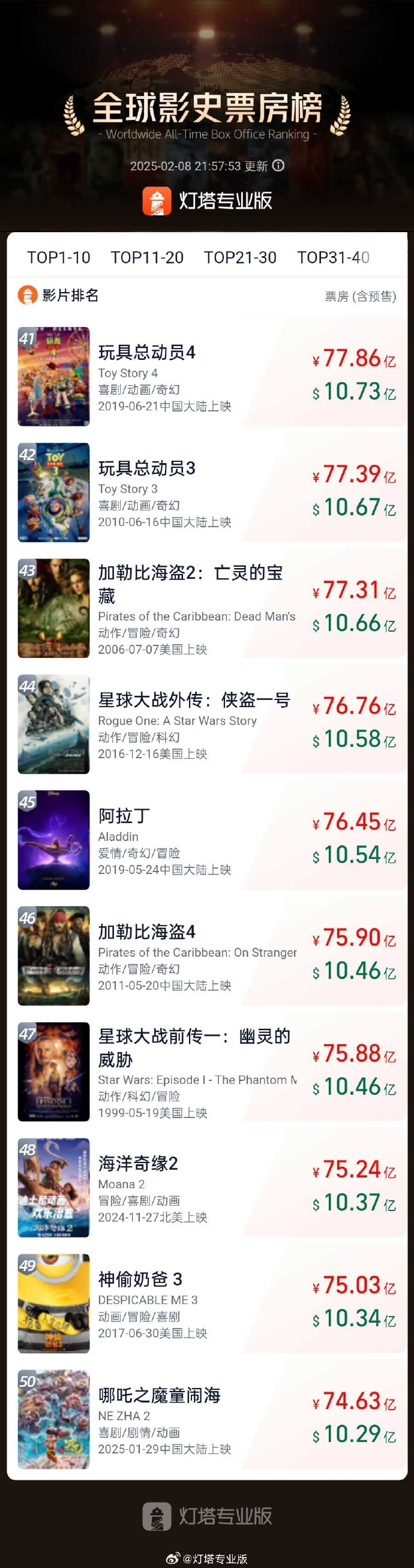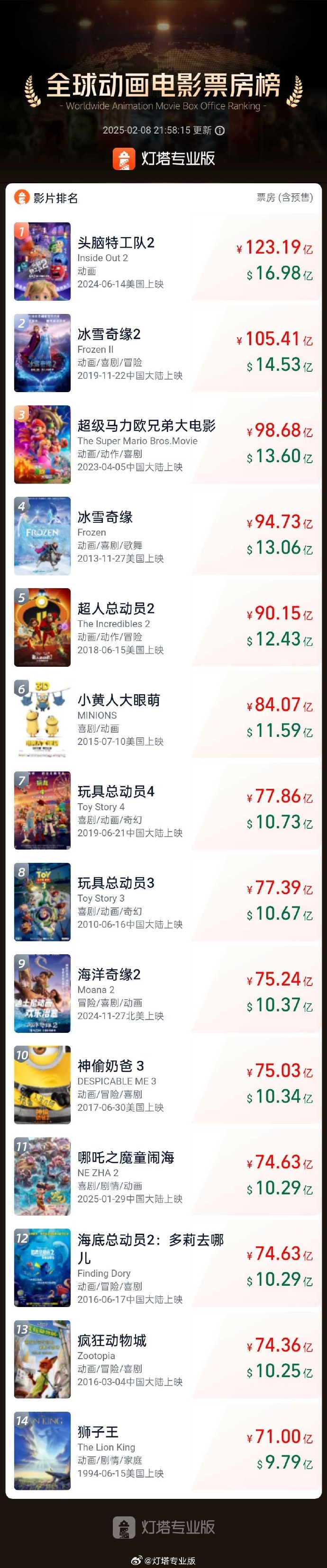 IT之家 2 月 8 日消息,据灯塔专业版,截至 2 月 8 日 21 时 57 分,影片《哪吒之魔童闹海》票房(含预售)突破 74.63 亿,进入全球影史票房榜前 50(唯一非好莱坞影片),同时进入全球动画片票房榜前 11。
