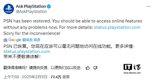 IT之家 2 月 9 日消息,在经历超 24 小时的中断后,PlayStation 网络服务终于重新恢复正常。