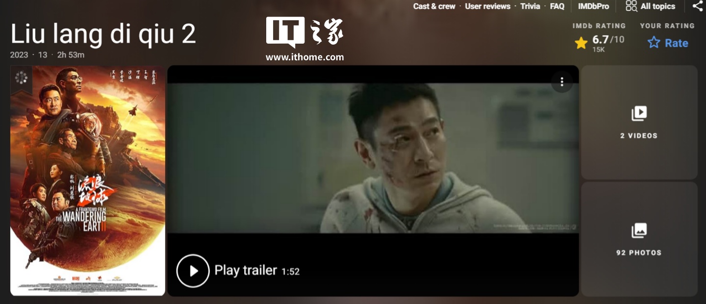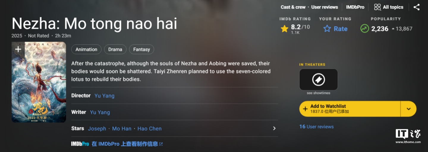 作为对比,第一部《哪吒之魔童降世》在 IMDb 评分是 7.4 分,《我不是药神》7.5 分、《流浪地球 2》6.7 分(IT之家注:开分 8.2,后续逐步降低,但 IMDb 评分为加权评分,未加权评分显示 7.7)。
