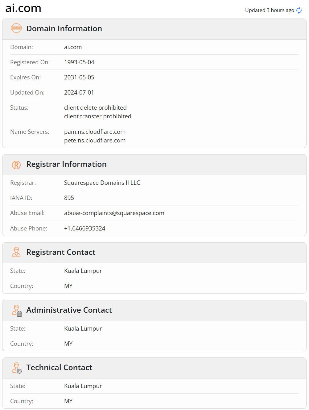域名网站 Whois 显示,这个 ai.com 域名有效期至 2031 年 5 月,注册联系人显示来自马来西亚首都吉隆坡。