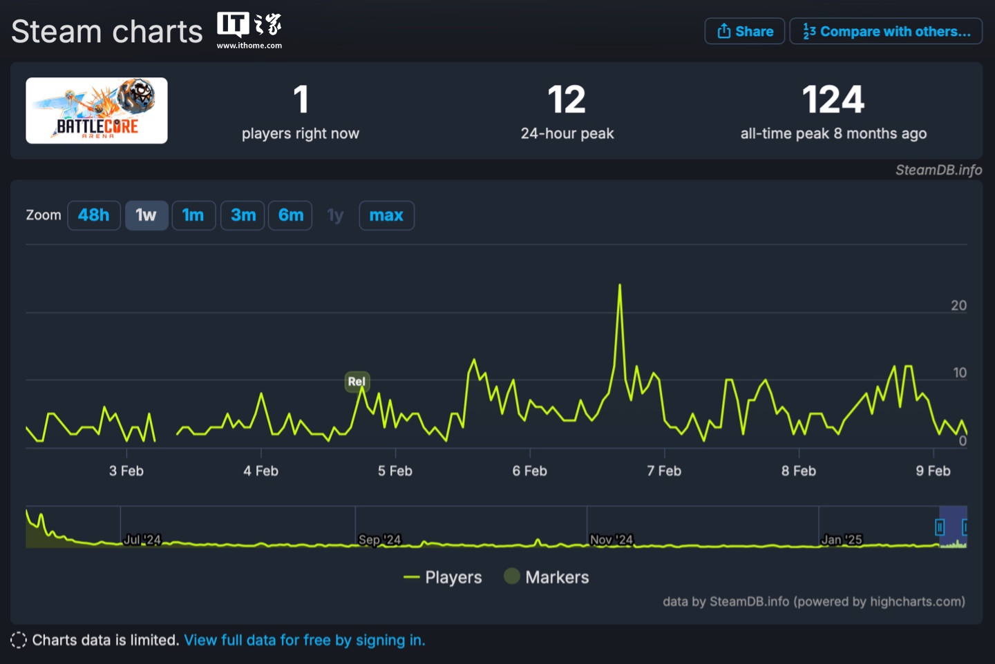 IT之家 2 月 9 日消息,育碧在 2 月 5 日正式推出了免费网游《BattleCore Arena(芯球争霸)》(此前为抢先体验),但这款游戏迅速迎来鬼服命运,从抢先体验到正式发售后的今天,这款游戏在 Steam 平台的玩家在线峰值量仅为 124 人,截至IT之家发稿,这款网游目前甚至只有 1 人游玩,可谓是该公司表现最差的免费网游。