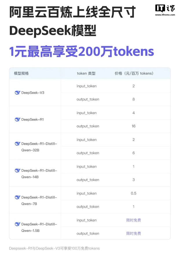 IT之家 2 月 9 日消息,阿里云宣布百炼平台全面上线 DeepSeek-V3、DeepSeek-R1、DeepSeek-R1-Distill-Qwen-32B 等 6 款全尺寸模型。DeepSeek-V3、DeepSeek-R1 满血版可享各 100 万免费 tokens,蒸馏版 1 元最高可享受 200 万 tokens,即日起,所有用户可直接使用。具体价格详见: