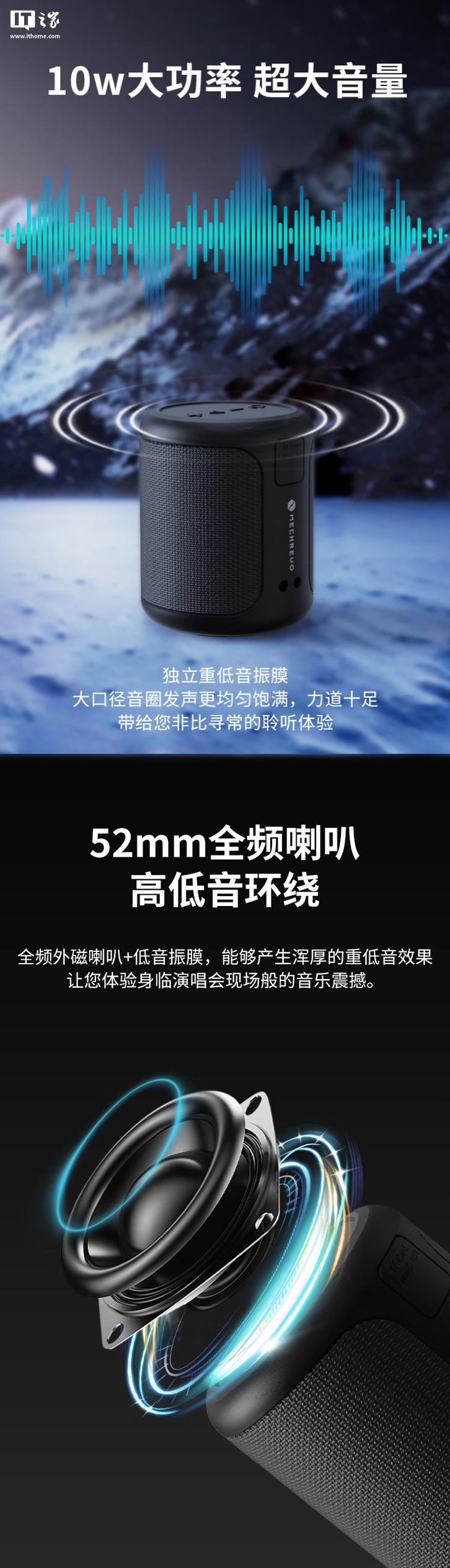 该音箱配备 52mm 全频喇叭,拥有 10W 功率,搭载蓝牙 5.3,支持 TWS 技术,两台音箱可以组合形成立体声,音箱本身配备 1800 毫安时电池,充电时间约 3.5 小时。