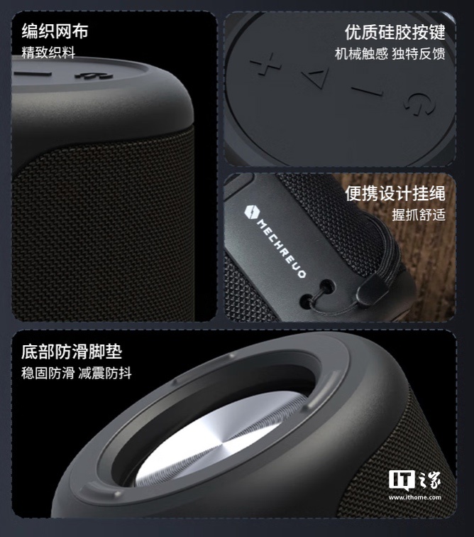 这款音箱整体采用黑色风格,造型圆润,覆盖有编织网布,顶部配备硅胶按键,带有挂绳设计,底部拥有防滑胶垫。