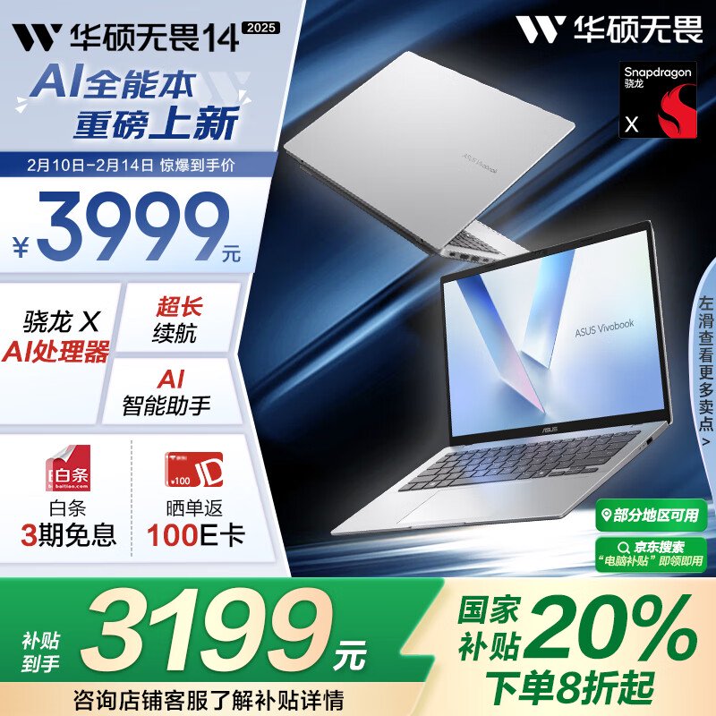 IT之家 2 月 10 日消息,华硕上周新推出了一款搭载骁龙 X 处理器的无畏 14 骁龙版 2025,官方定价 3999 元,补贴后 3199 元,2 月 10 日 10:00 开售。