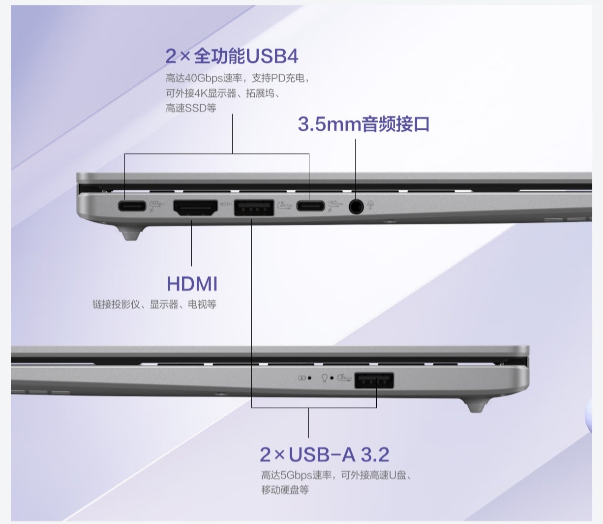 接口方面,机身左侧提供了双全功能 USB4 接口、1 个 HDMI 接口、2 个 USB-A 3.2 接口以及 1 个 3.5mm 音频接口,侧边采用了斜切收腰处理。