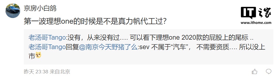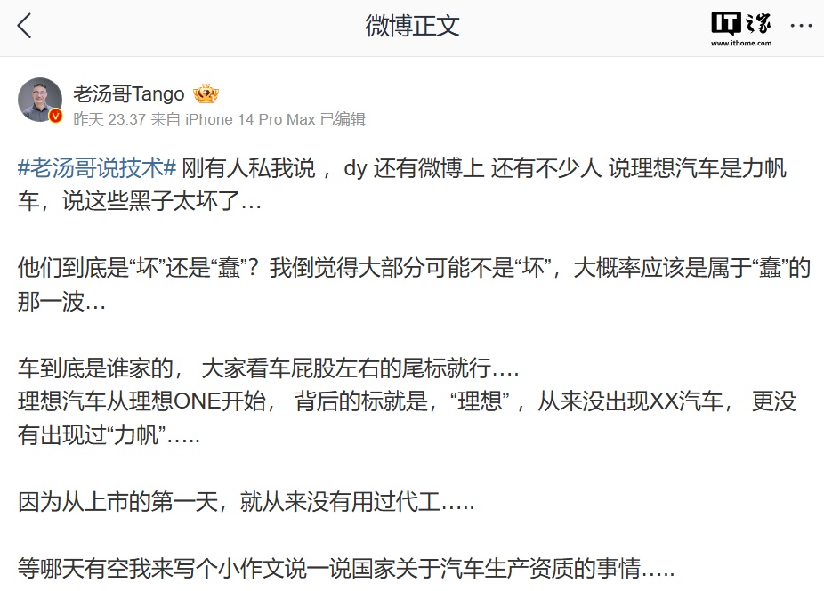 IT之家 2 月 10 日消息,理想汽车产品线负责人汤靖昨日晚间发文,否认理想汽车代工传言。他表示: