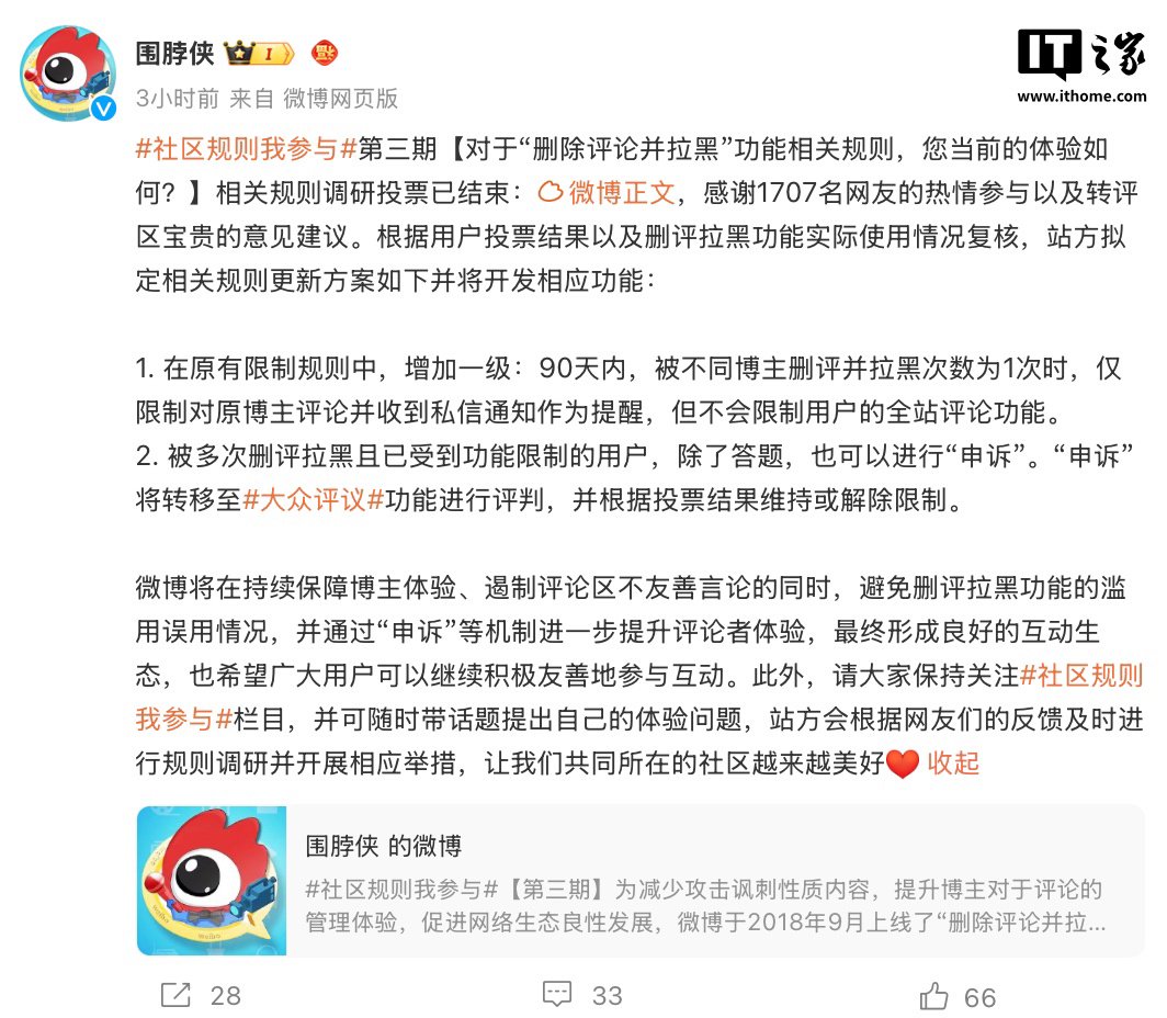 IT之家 2 月 10 日消息,微博社区观察员官方账号 @围脖侠 今天发文,宣布根据用户投票结果以及删评拉黑功能实际使用情况复核,站方拟定一系列规则更新方案。
